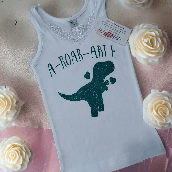 Introducing the A-Roar-Able Children’s Lace Neck T-Shirt from Heartfelt Inspirations! This beautifully designed top is available in any color, including a glitter option that adds a touch of sparkle to your child’s outfit. Crafted with love and attention to detail, our lace-necked tops are perfect for any occasion.