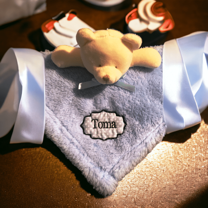 Looking for the ideal gift for a new baby? The Personalized Blue Teddy Comfort Blanket from Heartfelt Inspirations is the perfect choice! This gorgeous soft plush teddy bear comfort blanket can be personalized with any name, making it a special, one-of-a-kind gift.