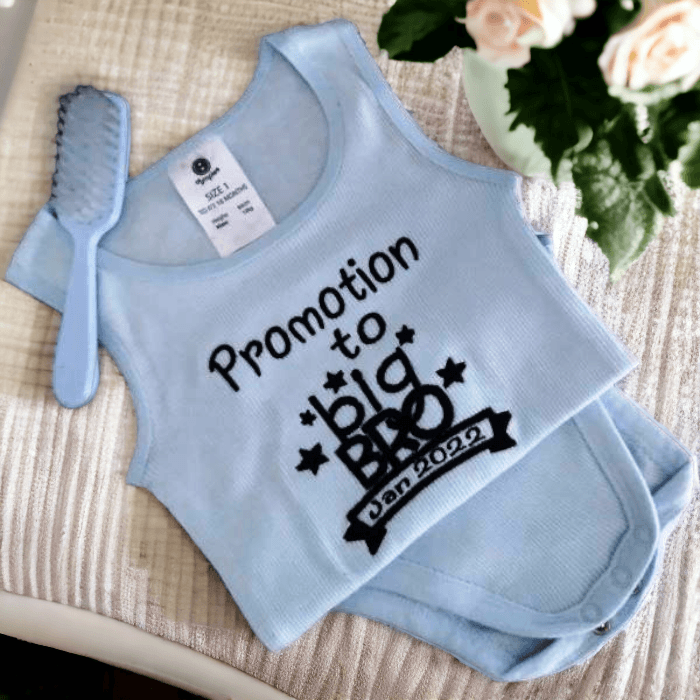 Introducing the Personalised Embroidered Promotion To Big Bro Romper Suit/Onesie from Heartfelt Inspirations. This adorable romper is perfect for announcing a promotion to big brother status. Unlike vinyl prints that can peel, our high-quality embroidery ensures the design lasts for the life of the product. Add any date to make it a keepsake that will be cherished forever. Designed with both style and durability in mind, this romper is a must-have for any growing family.