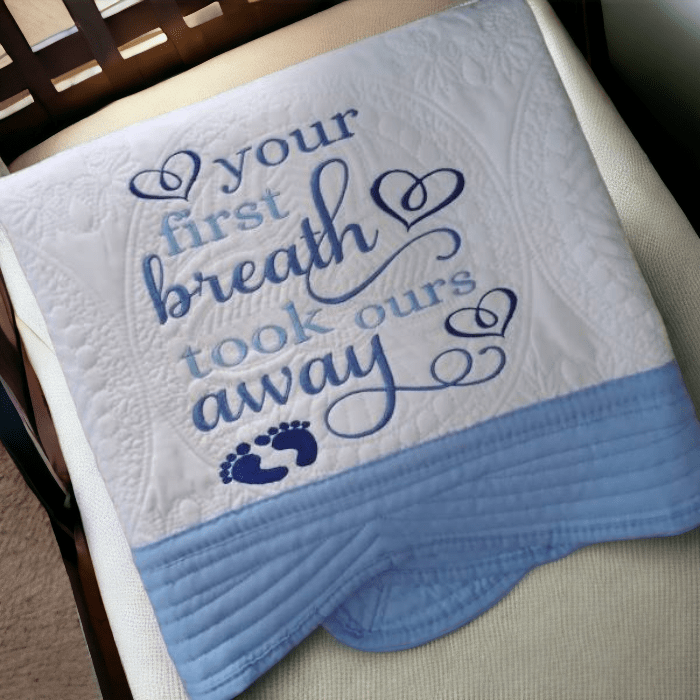 Introducing our timeless “Your First Breath Took Ours Away” Personalized Embroidered Heirloom Baby Cot Quilt. At Heartfelt Inspirations, we pride ourselves on providing baby quilts that are more than just a cover – they are cherished keepsakes designed to last a lifetime. Made from 100% soft cotton, these stunning quilts feature a beautiful scalloped edge and can be personalized to suit any gender. Ideal for baby gifts on any occasion, these quilts will never crack or fade like vinyl, printed, or sublimation products.