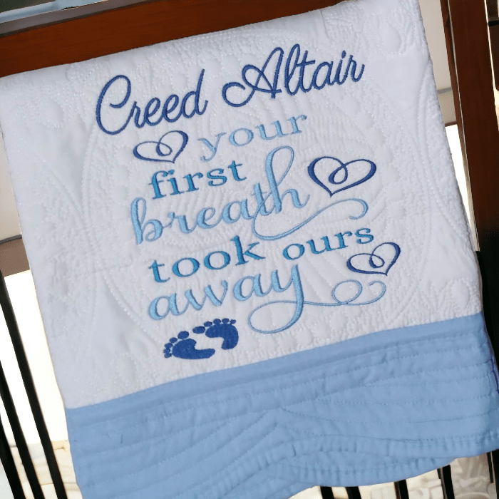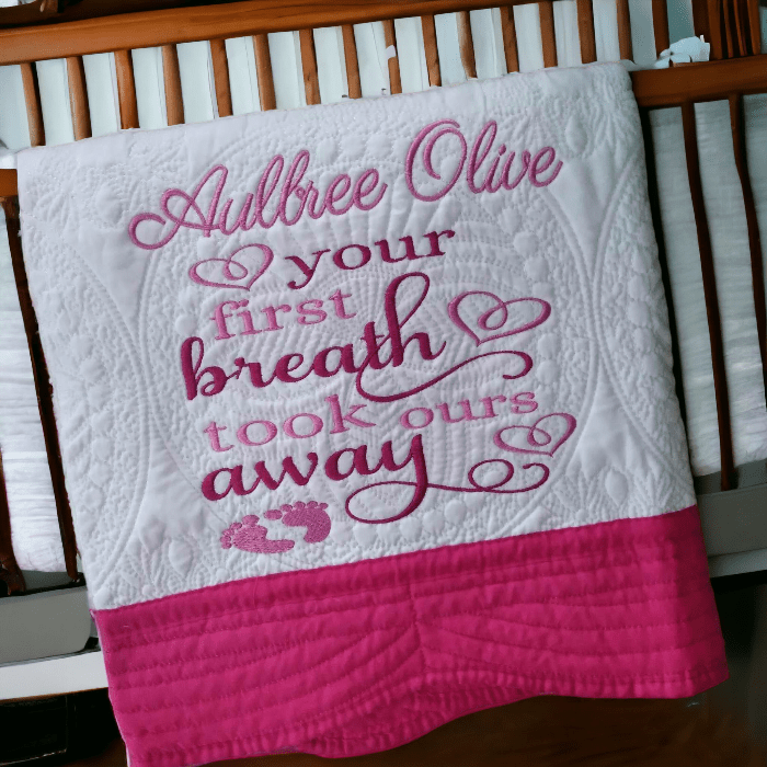 Your First Breath Tooks Ours Away Personalised Embroidered Heirloom Baby Cot Quilt